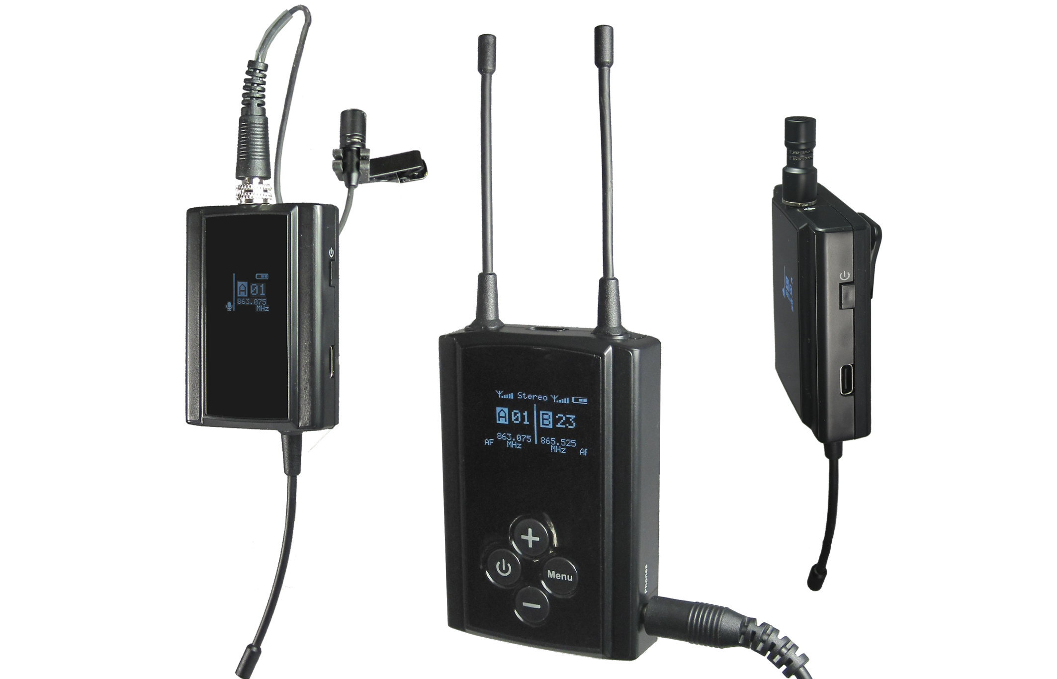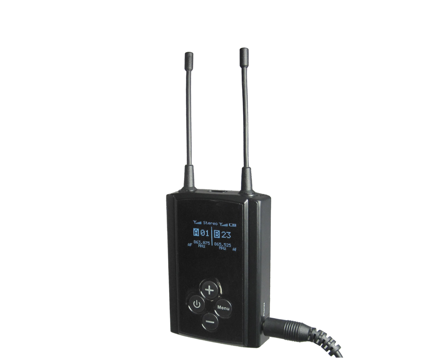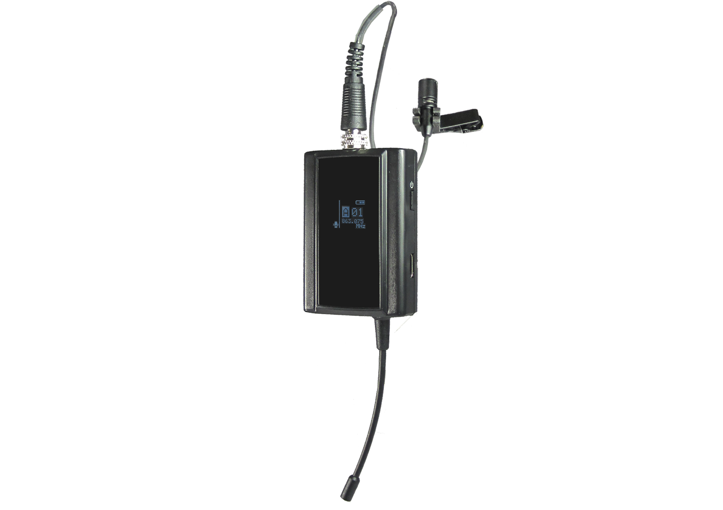 • Oled display channel number, audio level, signal strength, stereo/mono configuration and battery gauge