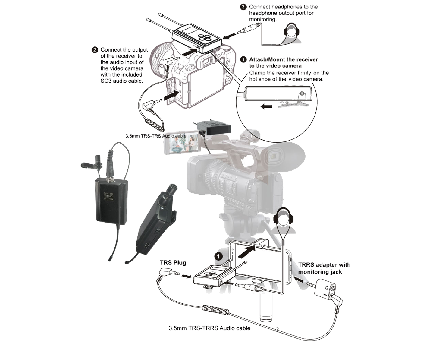 • Built-in microphone and TRS mic-in jack on transmitter